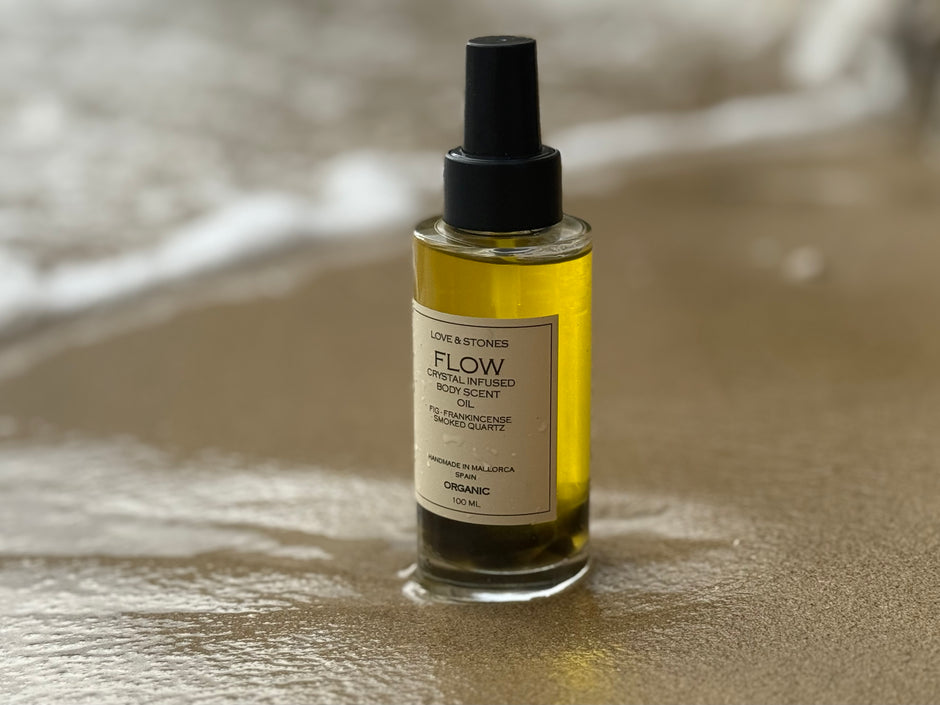 The body mist, body oil and scented roll-on Nine signature scents, each paired with a crystal that holds the same energy. The scent works instantly through your body — calming, clearing, grounding, or energising. The stone supports that feeling, helping it stay with you. Apply to your skin. Inhale slowly. Exhale. The scent shifts your state. The stone keeps you there. Carry your chosen feeling with you, throughout your day.